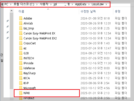 - 공동인증서는 보통 C:\Users\사용자명\AppData\LocalLow\NPKI 경로에 저장됨
