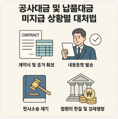 | 대금 전액 미지급 | 내용증명 발송 → 지급명령 신청 → 강제집행 | 상대방이 지급명령에 이의 제기하면 민사소송 진행 |