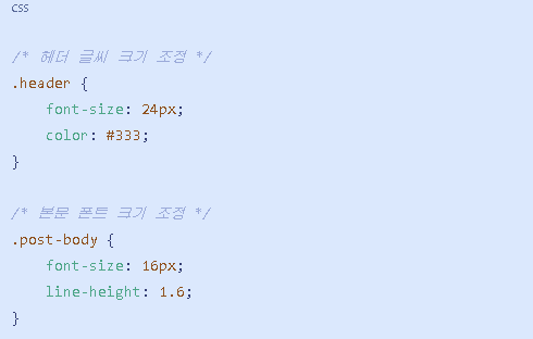 - 예를 들어, 내가 블로그 디자인을 수정할 때 사용했던 간단한 CSS 코드입니다: