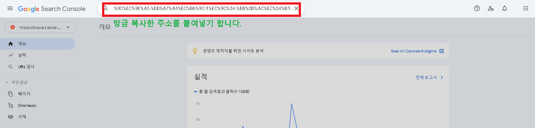 4. 예를 들어 티스토리 블로그에서 글을 지금 작성했다면 아래와 같이 작업하면 구글 서치콘솔에 색인색성 요청을 바로 할 수 있습니다. 아래 글은 방금 작성한 글입니다. 아래 이미지에서 녹색부분의 페이지 주소를 마우스 더블 클릭하여 전체 주소를 선택하고 CTRL + C 로 복사해 주세요