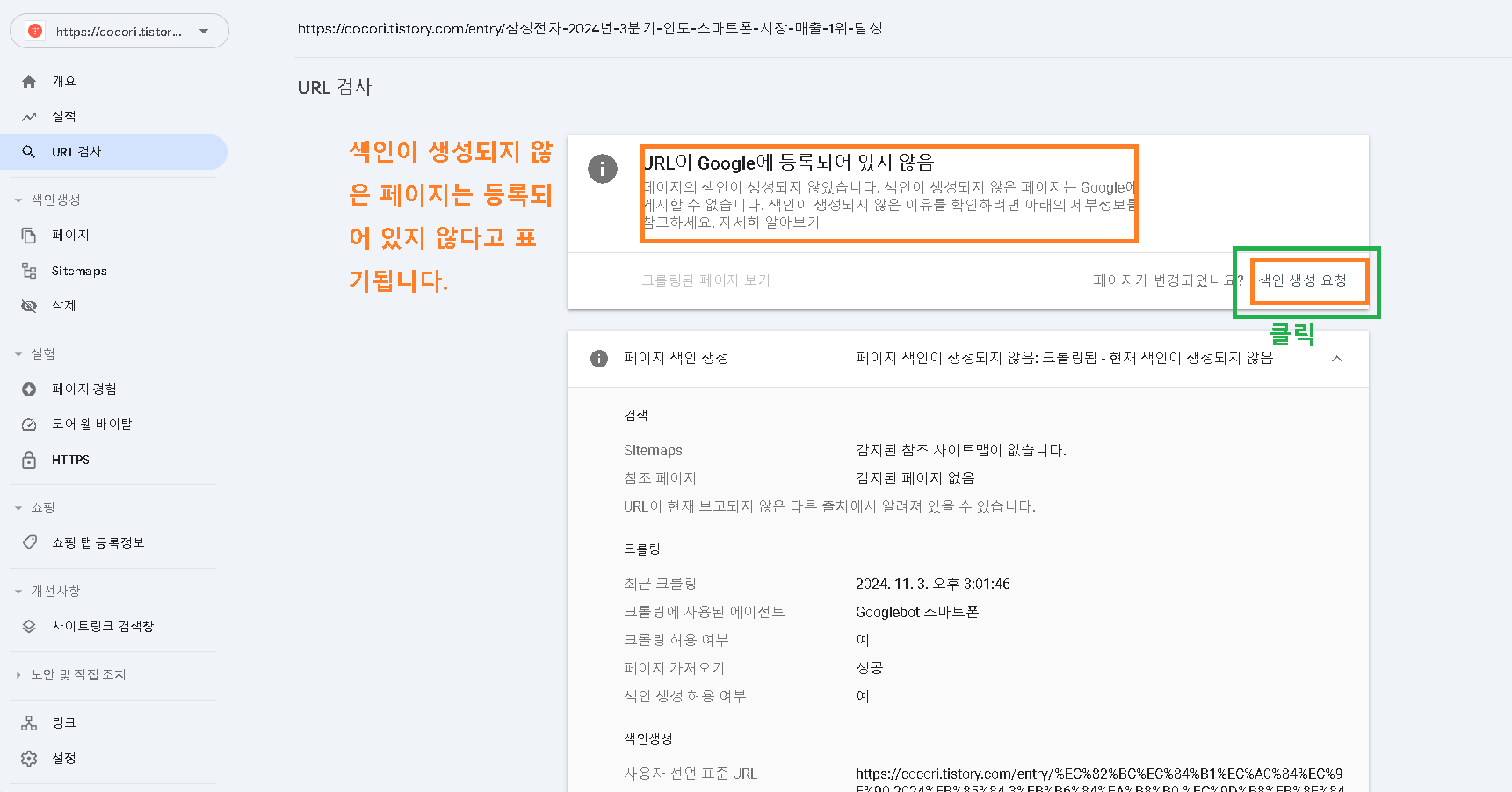 구글 서치 콘솔에서 소유권 확인된 블로그 페이지 색인생성 신청하는 간단한 방법