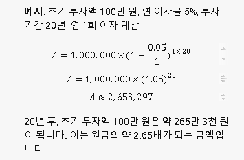 위 공식은 복리의 마법을 가능하게 하는 복리 계산 공식입니다. 이를 통해 복리 투자가 얼마나 큰 수익을 줄 수 있는지 알아보겠습니다.
