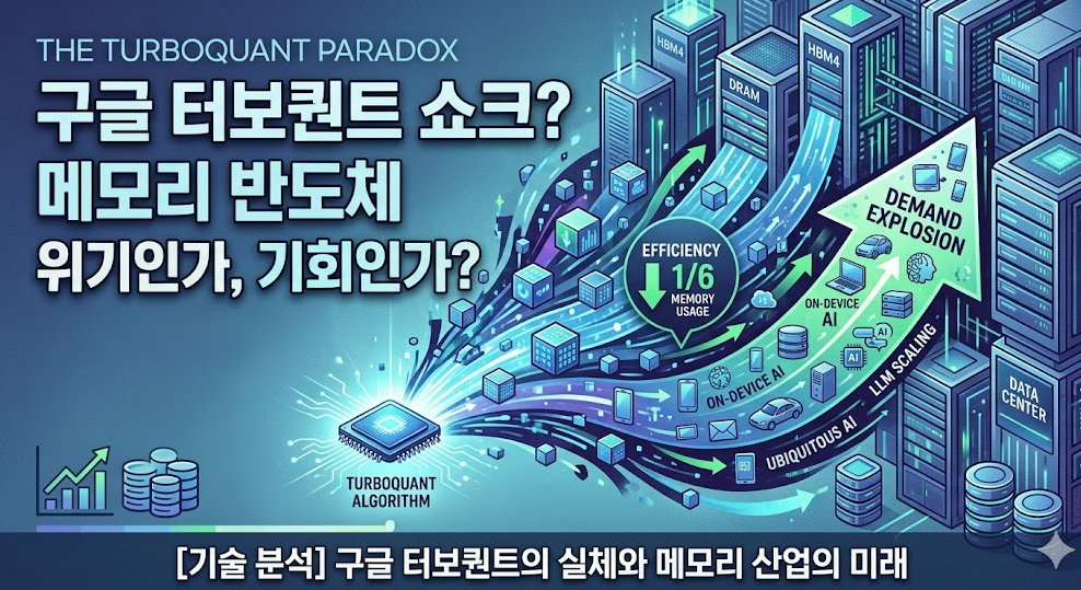 최근 구글 리서치(Google Research)가 발표한 '터보퀀트(TurboQuant)' 알고리즘이 반도체 시장에 파장을 일으키고 있습니다. AI 모델의 메모리 사용량을 최대 6배까지 줄일 수 있다는 소식에, 일각에서는 삼성전자와 SK하이닉스 같은 메모리 제조사의 수요가 급감할 것이라는 공포 섞인 전망을 내놓고 있습니다.