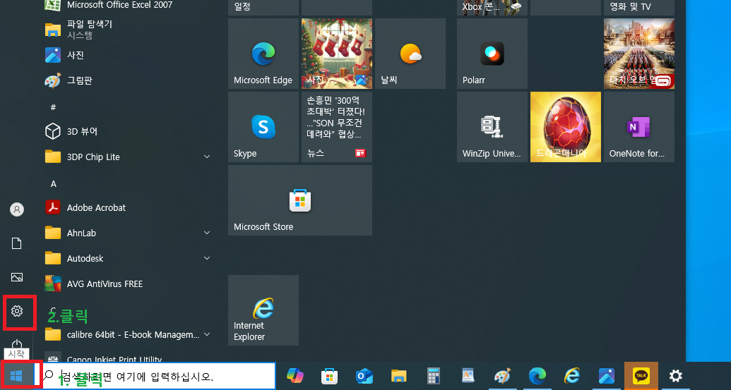 먼저 화면의 왼쪽하단에 있는 윈도우 로고 시작을 클릭하여 기어모양의 설정을 클릭합니다.