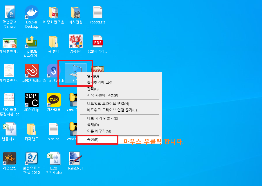 바탕화면에서 내PC 아이콘을 마우스 우클릭하여 맨아래 속성 으로 들어갑니다.