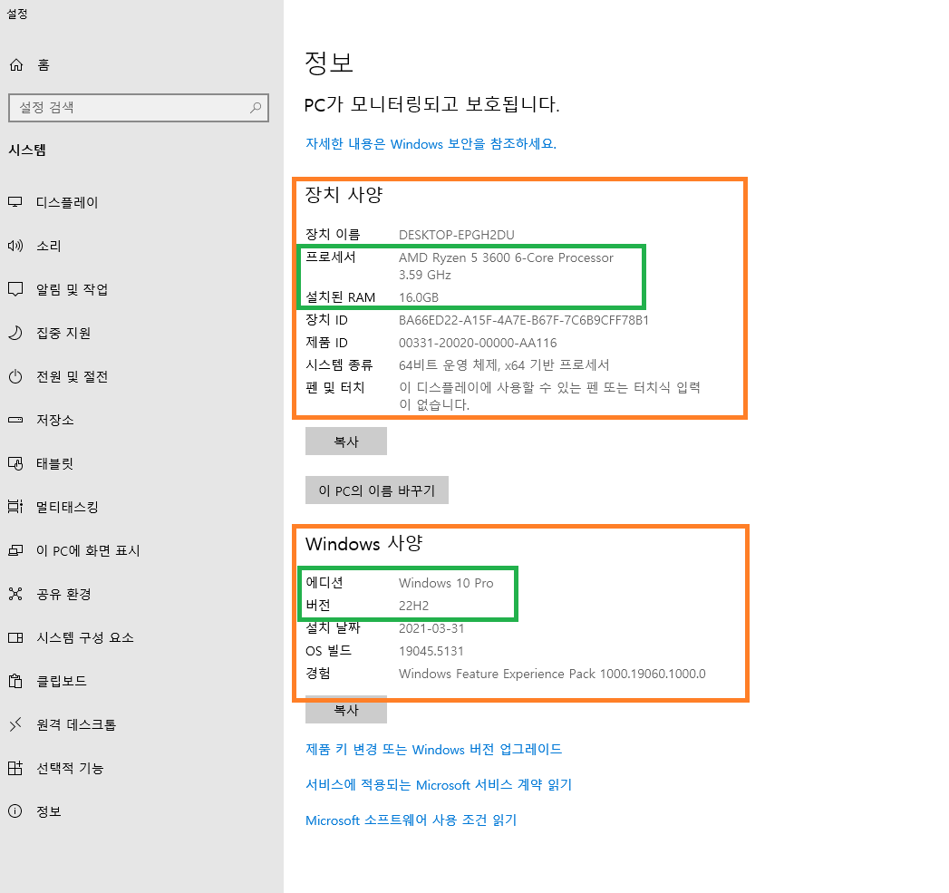 아까 보았던 다음과 같은 정보화면이 나오고 내 컴퓨터 시스템 사양과 윈도우 사양을 확인할 수 있습니다.
