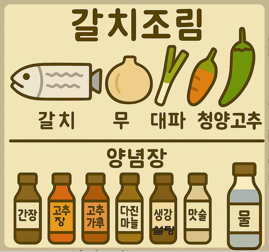 | 주재료 | 갈치 | 4~6토막 (약 500g) | 손질 후 씻어 물기 제거 |