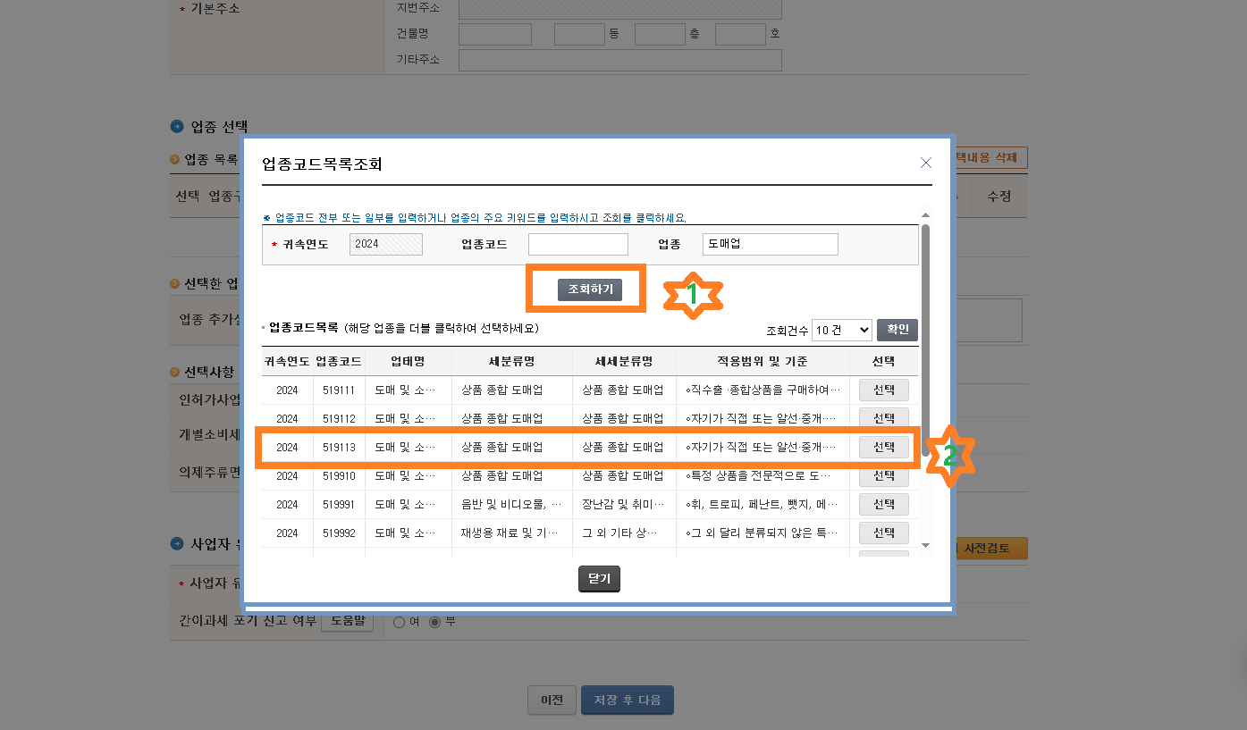 일반적인 종합 도매 및 소매업은 업종코드 519113으로 검색해서 등록합니다.(예시-자신의 사업 업종에 맞게 선택)