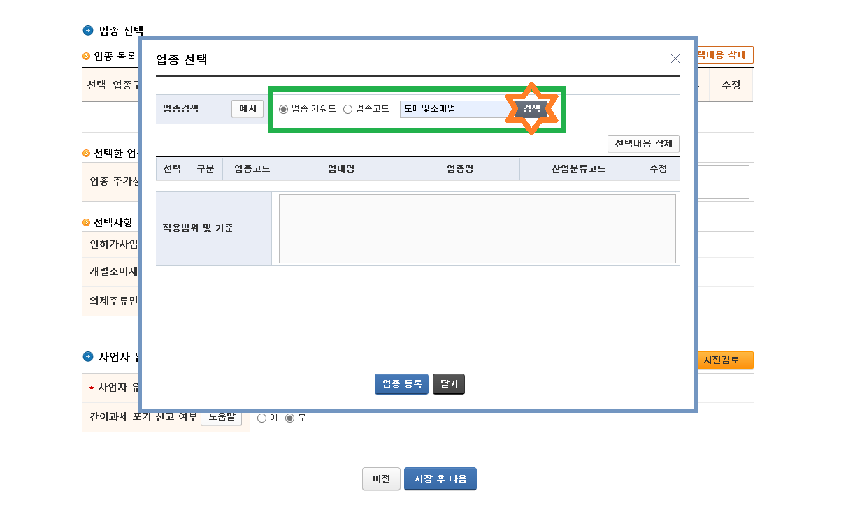 업종키워드를 활용해서 찾고자 한다면 업종키워드 예를 들어 도소매업 등으로 검색해서 가장 자신의 사업에 부합하는