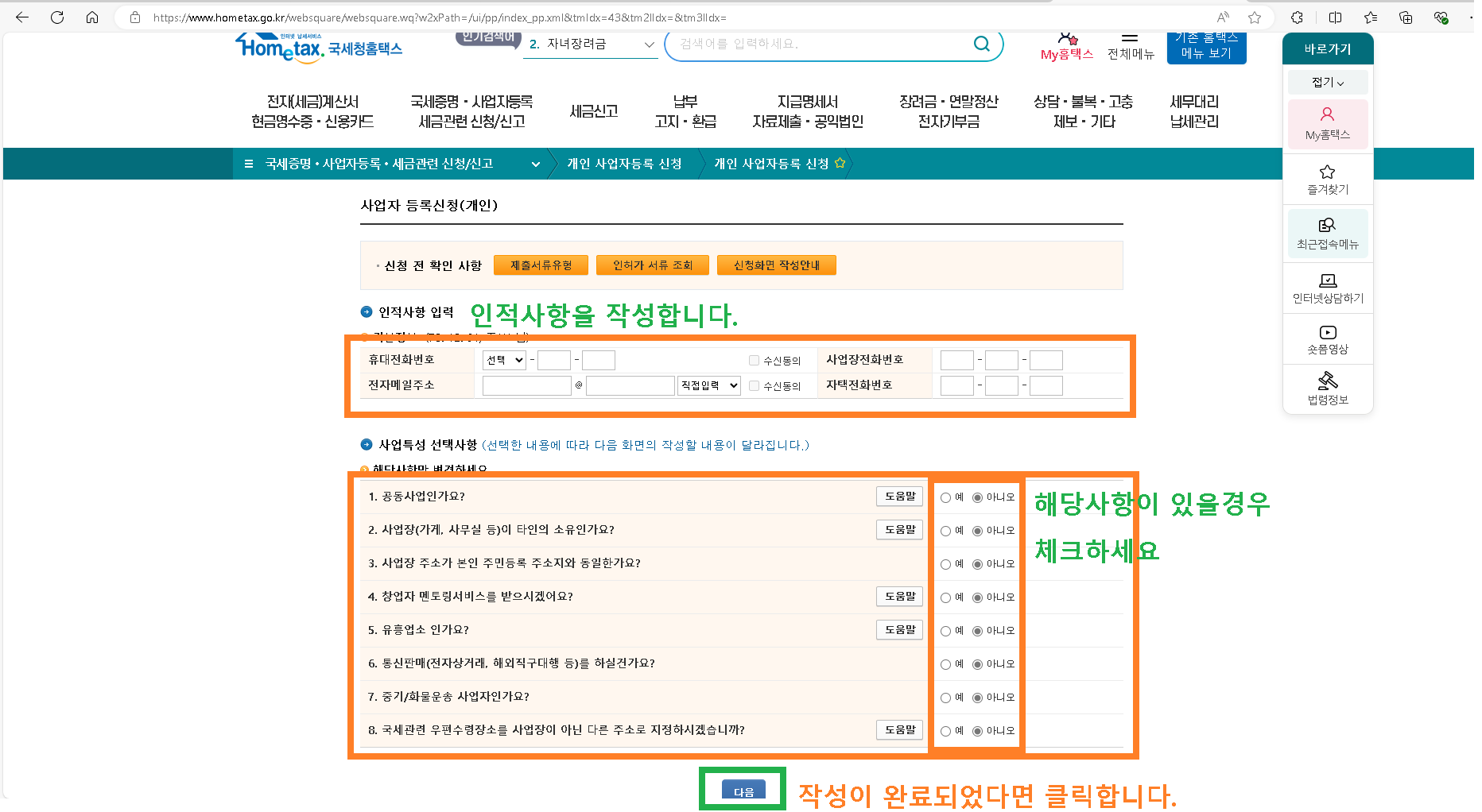 위 화면은 자신의 사업과 관련된 정보를 작성하고 사업특성을 체크하는 곳입니다.
