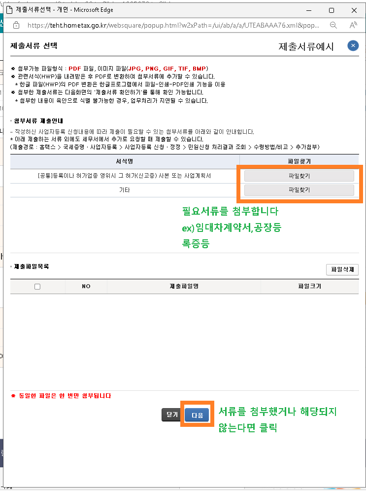 자신의 사업에 필요한 증빙 서류를 첨부하는 페이지 입니다.