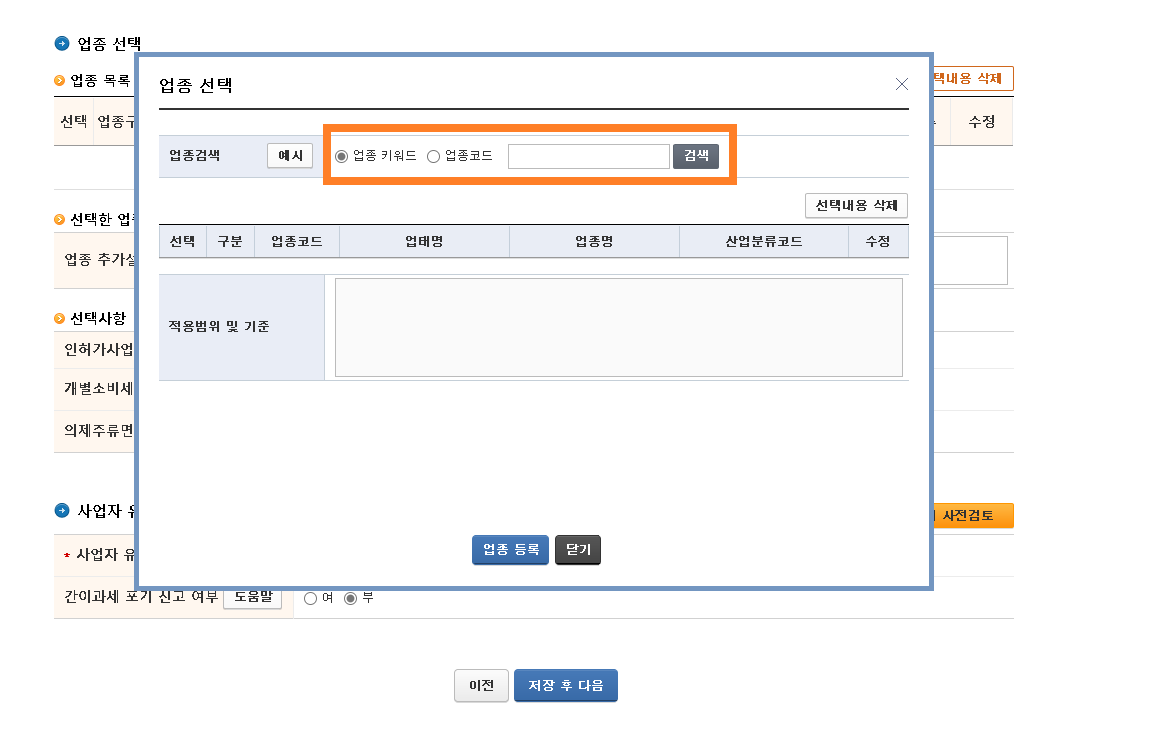 업종선택은 자신의 사업과 관련된 중요한 선택 부분입니다. 자신이 영위하고자 하는 사업과 가장 적합하고 유사성이 높은 업종을 선택하는 것이 좋습니다. 업종 입력/수정 탭을 클릭하면 다음과 같은 화면이 뜹니다.