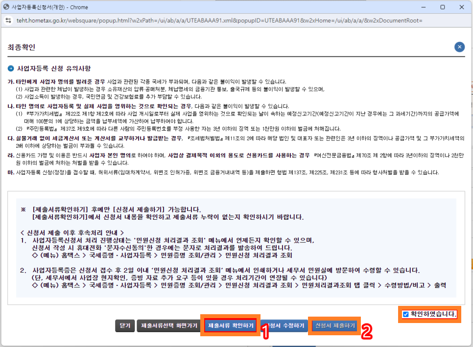 이제 제출서류 확인하기 버튼을 클릭하면 신청서 제출하기가 활성화 됩니다. 신청서 제출하기 버튼을 눌러서 사업자등록증인터넷으로 발급하기를 마무리합니다.