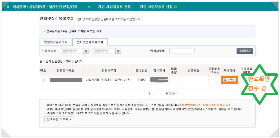 마지막으로 인터넷접수목록조회를 확인하여 사업자등록 신청이 완료되었는지 확인합니다.