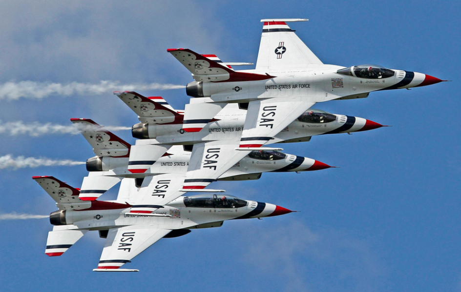 미국 공군을 대표하는 썬더버드는 1953년 창설된 이후 현재 F-16C/D 파이팅 팰컨을 주력 기종으로 사용합니다. 매년 공군 전역에서 지원자를 모집하며 비행 기량은 물론 국가 홍보 대사로서의 품격과 소통 능력을 엄격히 검증하여 선발하는 것이 특징입니다. 선발된 인원은 약 6개월간의 고강도 팀 훈련을 거쳐야만 비로소 정식 멤버로 인정받을 수 있습니다. 이들은 F-16의 우수한 추력 대 중량비를 활용하여 시속 1,000km 이상의 고속에서 펼쳐지는 역동적인 대형 전환과 교차 비행을 선보이며 미 공군 전술의 정점을 상징하는 팀으로 군림하고 있습니다.