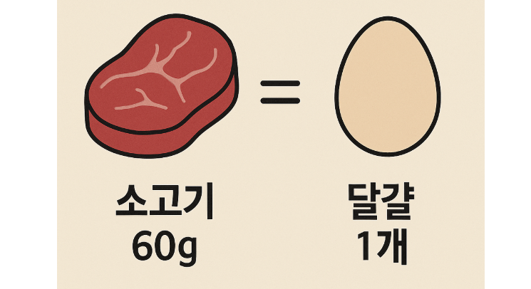 ※ 달걀 1개의 평균 무게는 약 60g입니다. 따라서 60g 소고기 vs 달걀 1개는 무게 기준으로 정확한 비교가 가능합니다.
