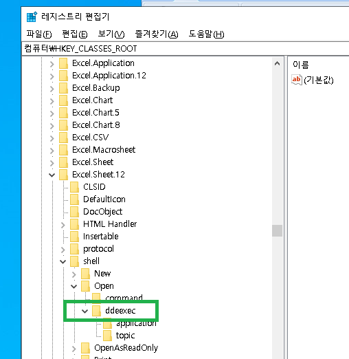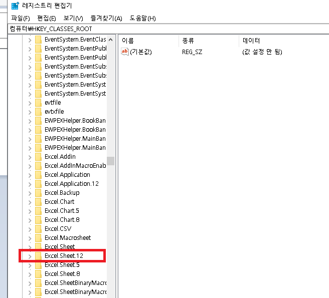 3. HKEY_CLASSES_ROOT 클릭후 Excel.Sheet.12를 찾아 클릭합니다.