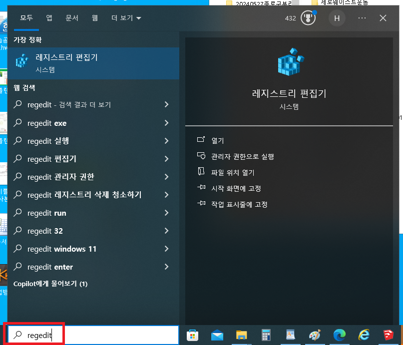 1.아래 화면처럼 윈도우 화면에서 돋보기 모양에 regedit 라는 명령어를 입력하고 레지스트리 편집기를 실행합니다.