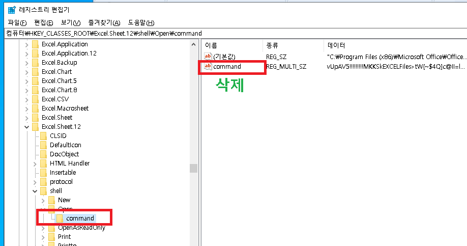 6.Shell 폴더 하위의 command 를 클릭합니다. 우측항목에 있는 command를 마우스 우클릭으로 삭제합니다.