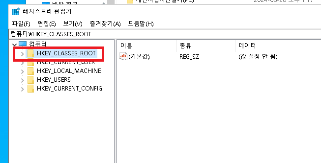 2. 아래 화면의 레지스트리 편집기에서 빨간네모의 HKEY_CLASSES_ROOT를 클릭합니다.
