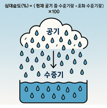 상대습도(%) = (현재 공기 중 수증기량 ÷ 포화 수증기량) × 100
