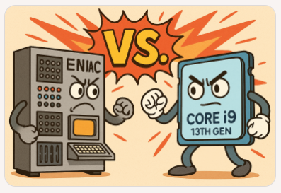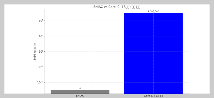 위 그래프는 ENIAC과 Core i9 13세대 CPU의 연산 성능(MIPS 기준)을 로그 스케일로 비교한 것입니다.