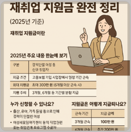 재취업 지원금은 경력이 끊긴 여성분들이 다시 경제적 자립을 하고 일터에 안정적으로 적응할 수 있도록 돕는 든든한 제도입니다.