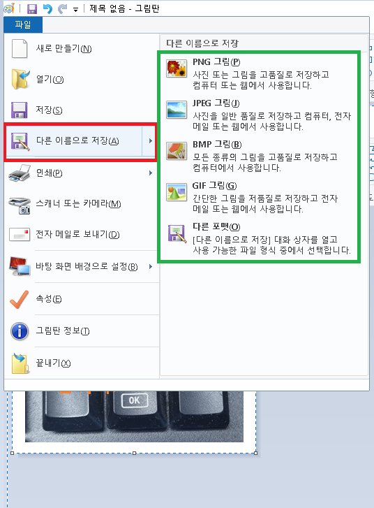 아래 이미지 처럼 다른이름으로 저장을 선택한 후 오른쪽에 원하는 저장 파일을 선택해서 저장하면 원하는 이미지가 저장 됩니다.