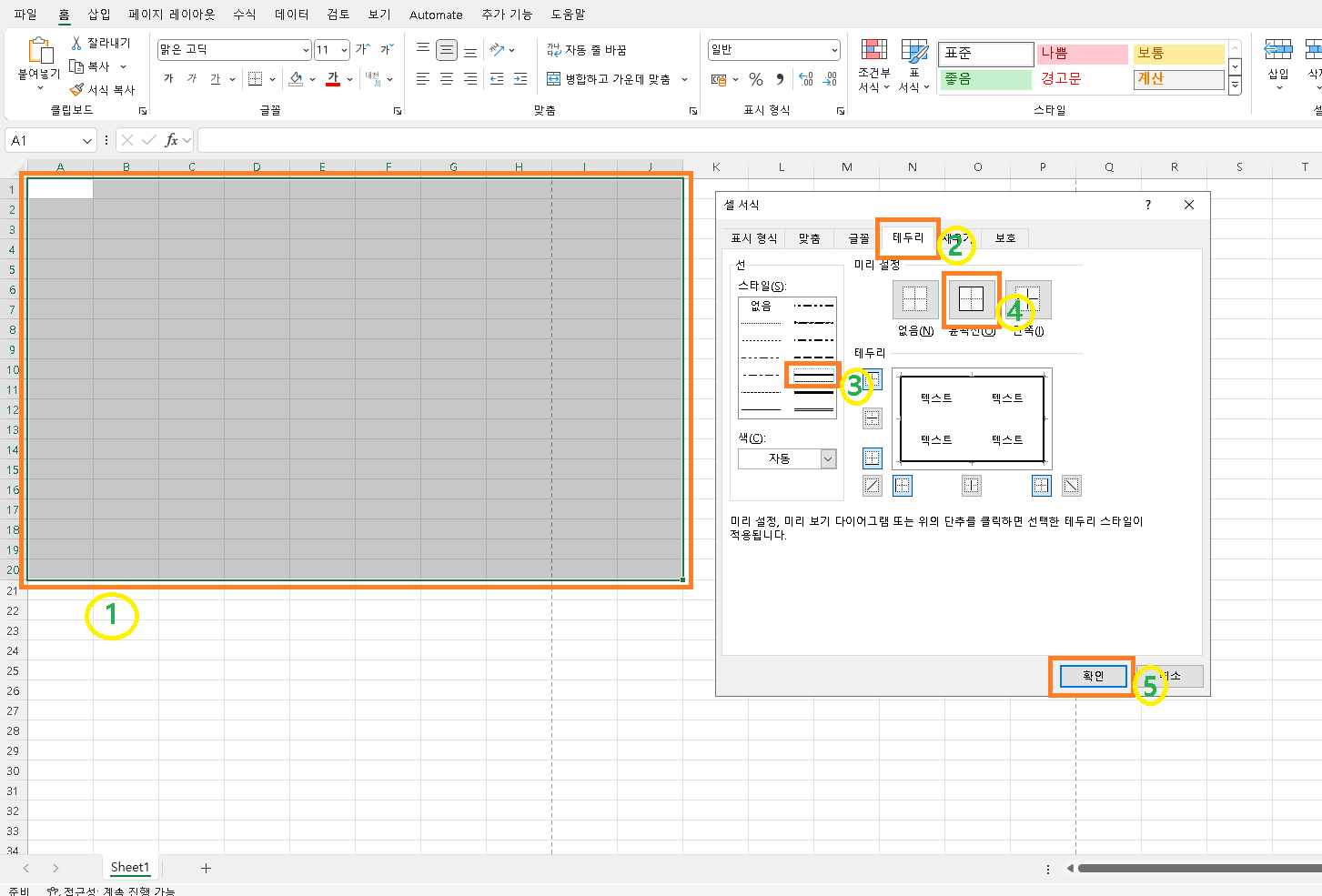 1번과 같이 J20까지(드래그한 영역 오른쪽하단 끝셀) 영역을 마우스로 드래그 합니다. 키보드 왼쪽하단 컨드롤키(Ctrl키)+숫자 1을 누르면 셀서식 창이 뜹니다. 서식창에서 2번과 같이 테두리를 클릭하고 3번선을 선택 4번 윤관석을 선텍하고 5번 확인을 누릅니다. 그러면 견적서 기본 틀을 만들수 있습니다.