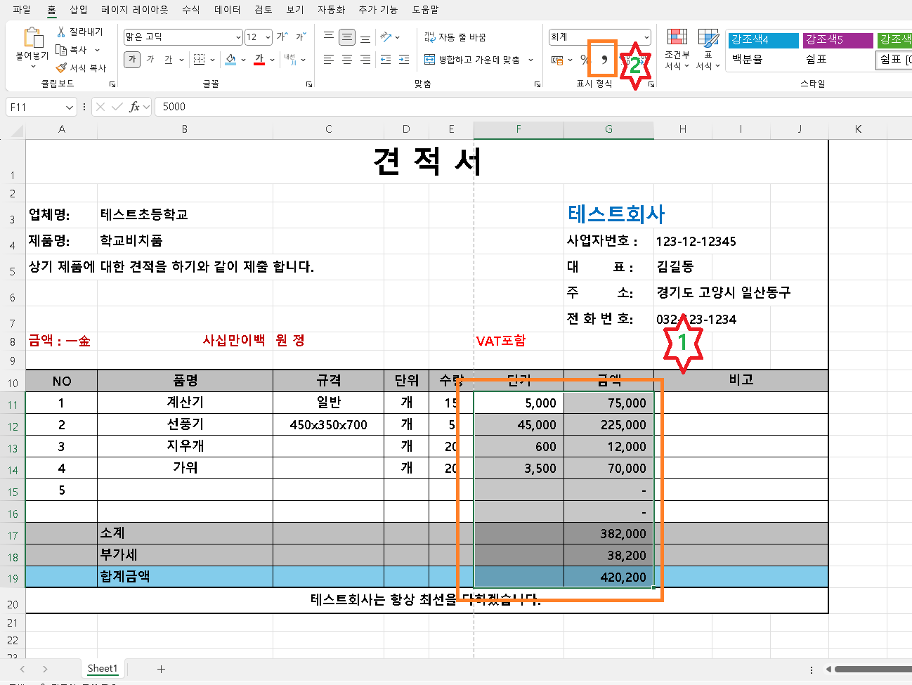 금액부분처럼 자신의 스타일대로 글자색을 넣고 1면 단가금액 영역을 마우스로 드래그하여 2번 쉼표를 클릭하면 단가및금액에 쉼표가 첨가되면서 금액단위를 쉽게 알수 있게 됩니다.