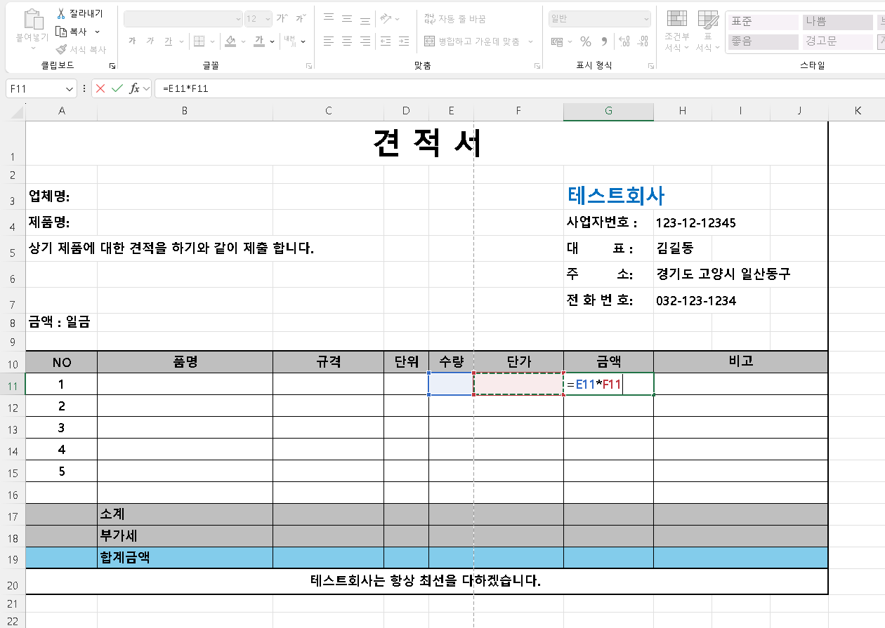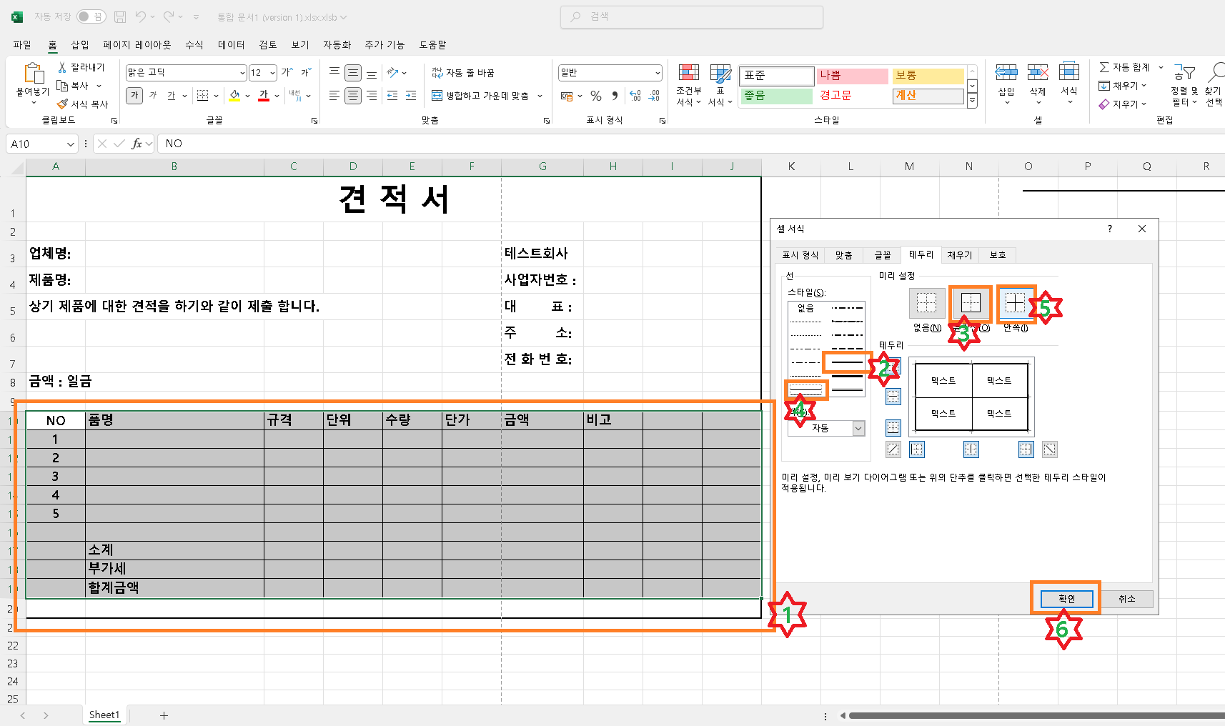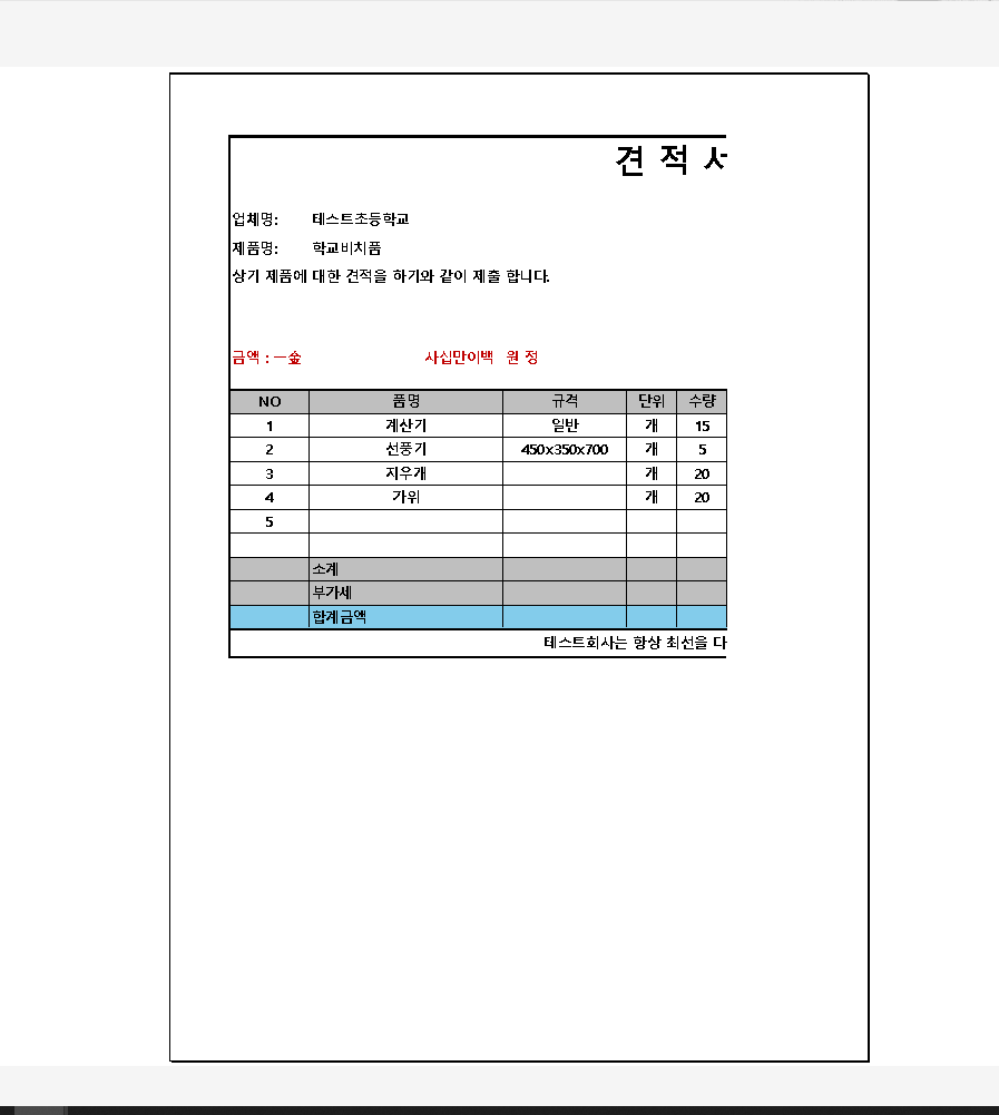 그다음 6번 확인을 누릅니다. 이제 기본적인 견적서 외관이 완성되었습니다.