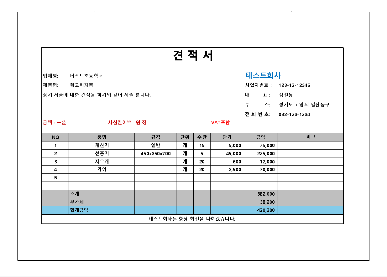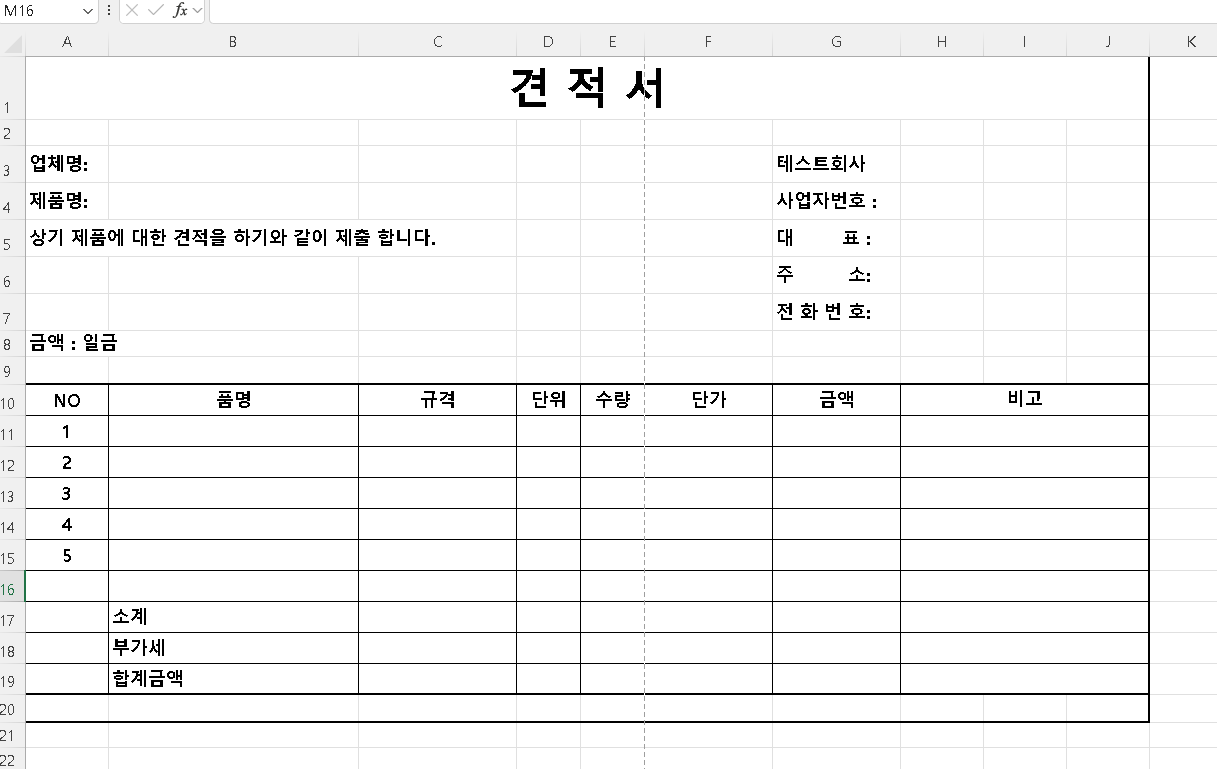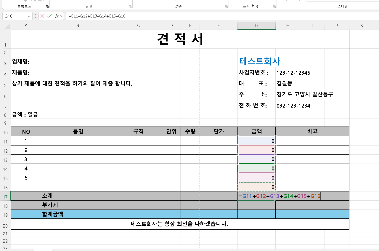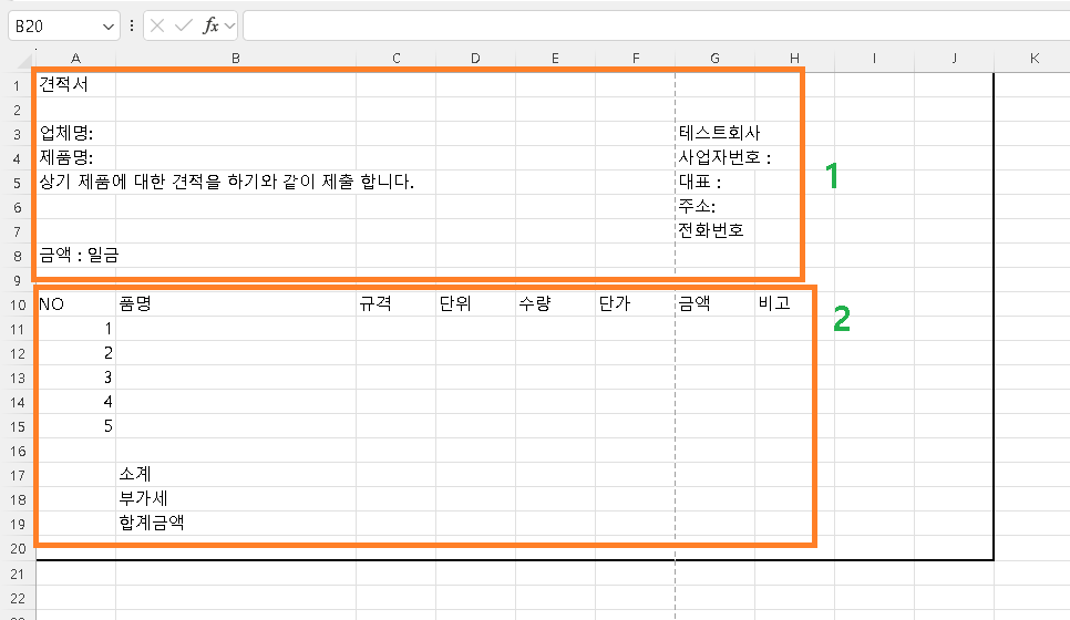 그다음 6번 확인을 누릅니다. 이제 기본적인 견적서 외관이 완성되었습니다.