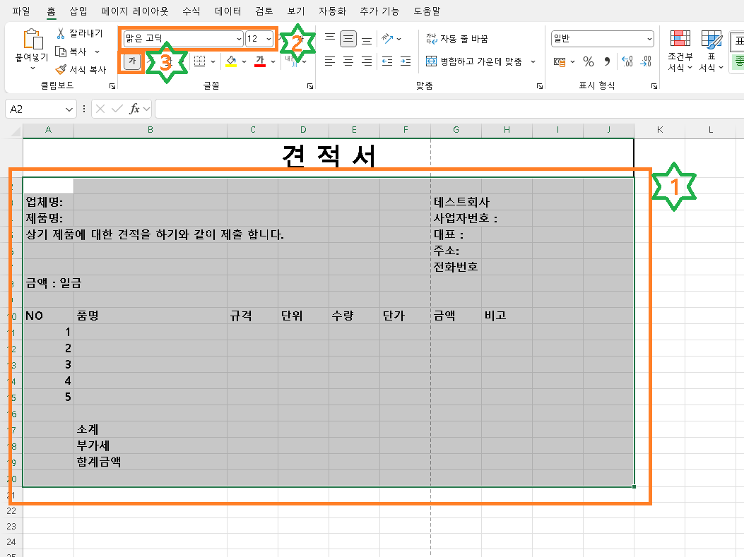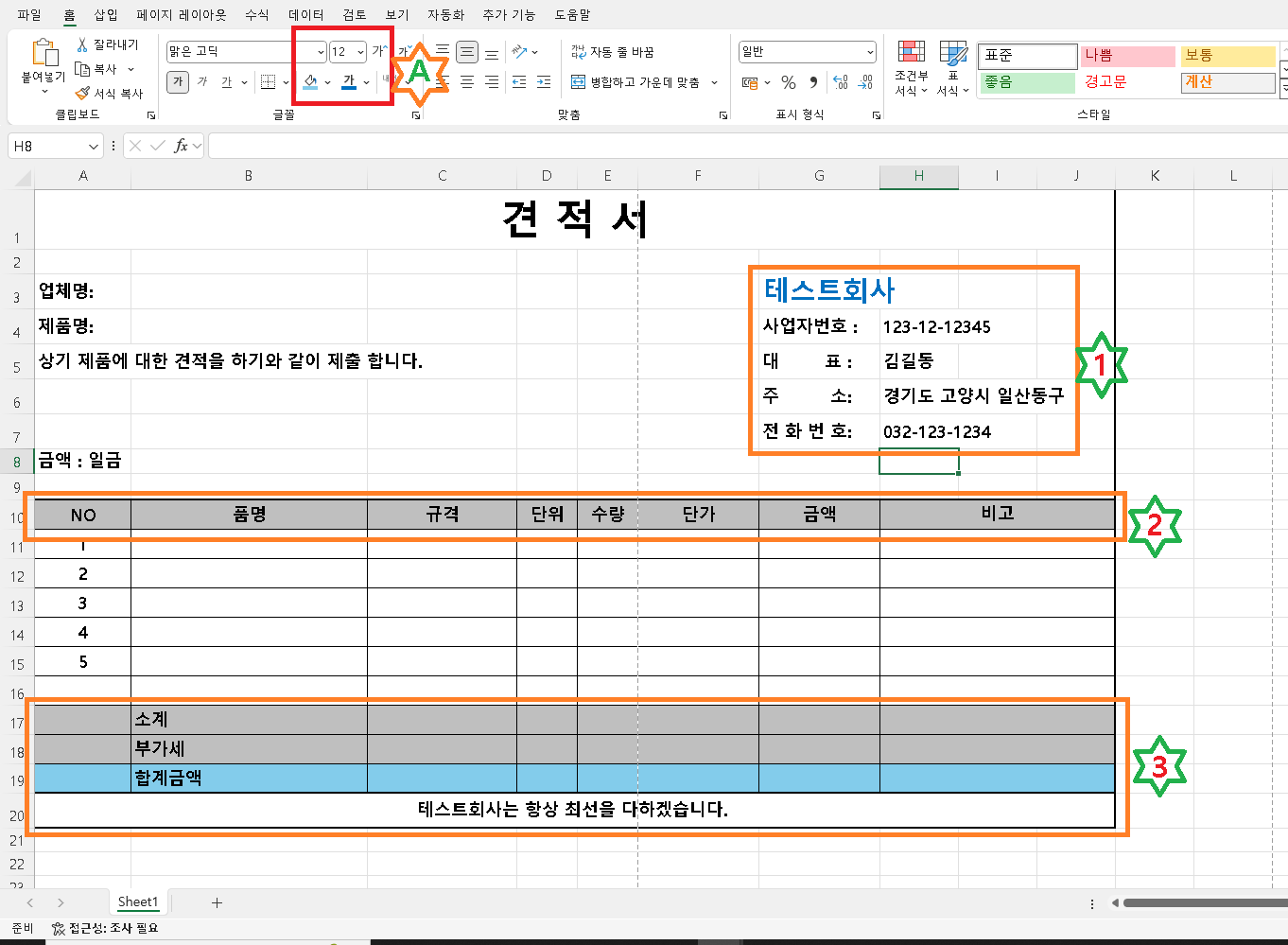먼저 1번 영역에서 자신의 회사이름이 들어있는 셀을 선택하고 글자크기를 조정하고 글자색상 넣기를 눌러 자신의 스타일 데로 수정합니다. 2번 목록 영역을 마우스로 드래그한다음 A번 색상넣기 기능을 활용하여 자신의 스타일 데로 색상을 첨부합니다. 마찬가지로 3번에서도 마우스로 영역을 드래그한 후 자신의 스타일 데로 색상을 넣으면 됩니다.