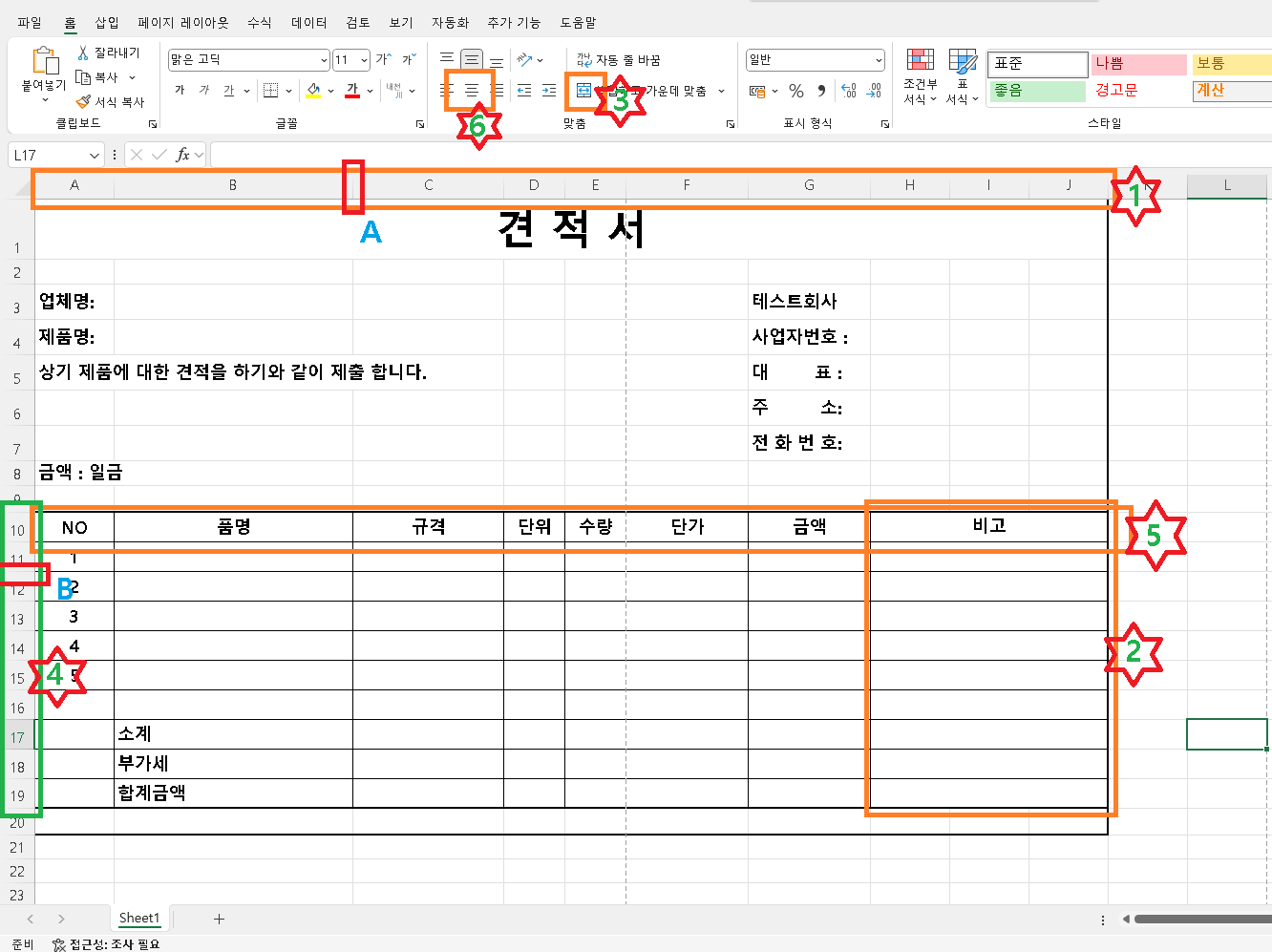 먼저 1번과 같이 알파엣이 써진 영역에 A와 같은 작은 세로줄이 있는데 이부분에 마우스를 위치하면 세로칸 전체를 좌우로 넓히거나 줄일수 있습니다. 이를 활용하여 품명이나 규격등 긴내용이 들어가는 것은 넓히고 단위 수량과 같이 내용이 적은것은 줄여서 보기 좋게 만듭니다. 마찬가지로 4번과 같이 세로숫자 사이에 B와 같이 라인이 있는데 각줄을 마우스를 이용하여 넓히거나 줄일 수 있고 마우스로 드래그하여 변경하고자하는 숫자까지 영역을 표시한다음 그중 B와 같은 작은 라인 1개만 조정하면 선택된 영역의 모든 영역의 높이를 일관된 넓이로 조정할 수 있습니다. 이를 활용하여 각 칸의 넓이를 조정합니다. 그다음 2번 비고란이 3칸으로 적용되어 있는데 가로 3칸을 마우스로 드래그하여 영역을 지정한다음 3번 병합하고 가운데를 눌러 셀을 병합합니다. 그다음 5번 N0 품명 규격 등등 있는 칸을 마우스로 드래그하여 영역을 지정하고 6번 가운데로 정렬을 눌려 글자가 중앙에 위치하게 조정합니다.