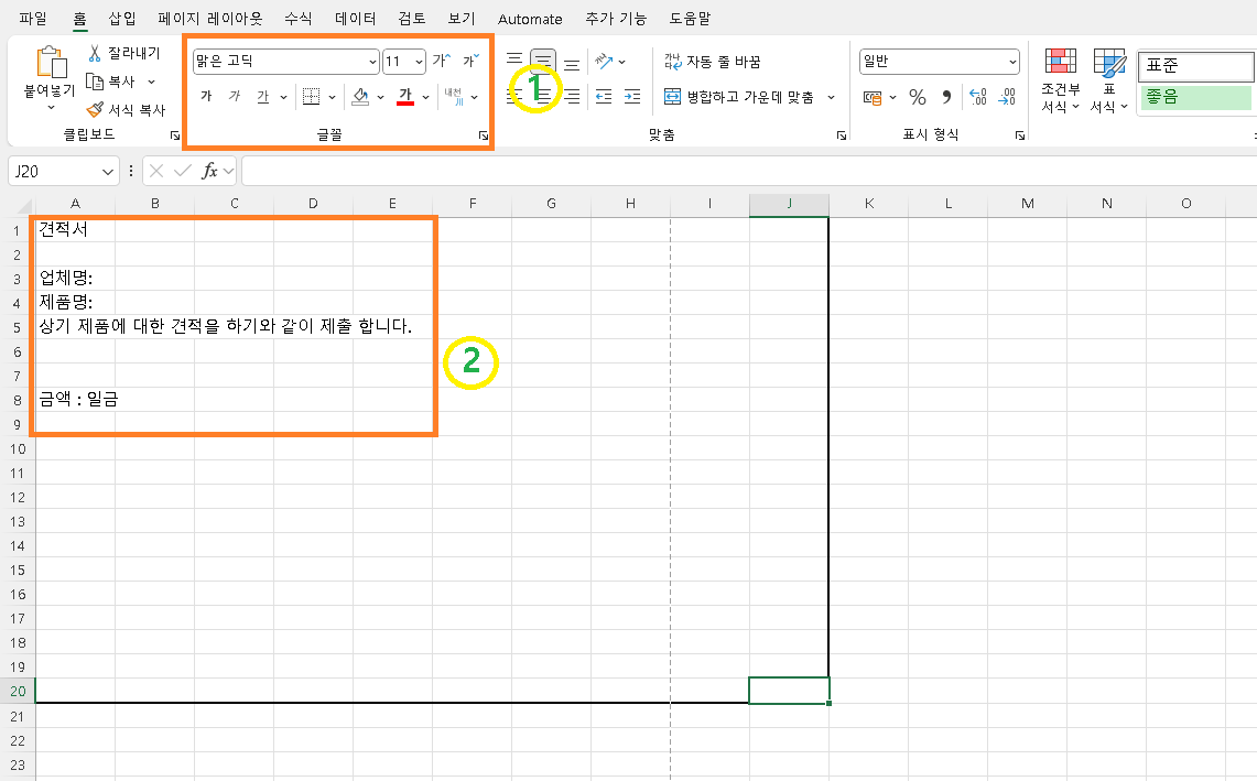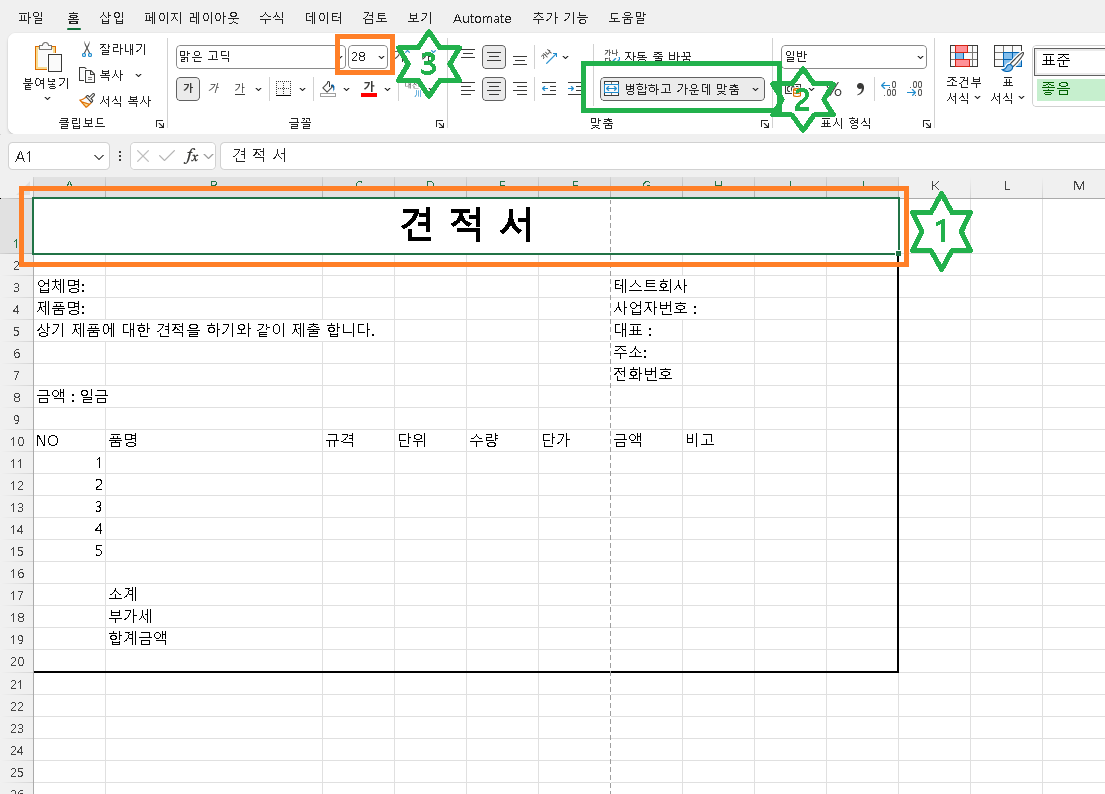 이제 기본틀과 기본 내용을 작성했으니 텍스트와 칸등을 만들어 보도록 하겠습니다. 먼저 1번과 같이 기존에 작성해논 "견적서"라는 글자크기와 위치를 잡는 방법입니다. 먼저 기존에 작성해둔 틀에서 1번 A1~J1 까지 마우스로 드레그하여 영역을 만든다음 2번 병합하고 가운데 맞춤을 클릭합니다. 다음 3번과 같이 글자 크기를 28로 합니다. 자신의 구미에 맞게 글자크기는 조정해도 되고 글자 간격도 글자셀에 마우스 더블클릭후 글자 사이를 스페이스바 눌러서 넓히거나 좁히면 됩니다.