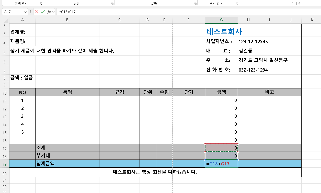 마지막 합계금액은 소계 + 부가세 이므로 위와 같은 방법으로 =G18+G17이라고 쓰고 엔터 하면되고 마우스를 활용해서 적용해도 됩니다.