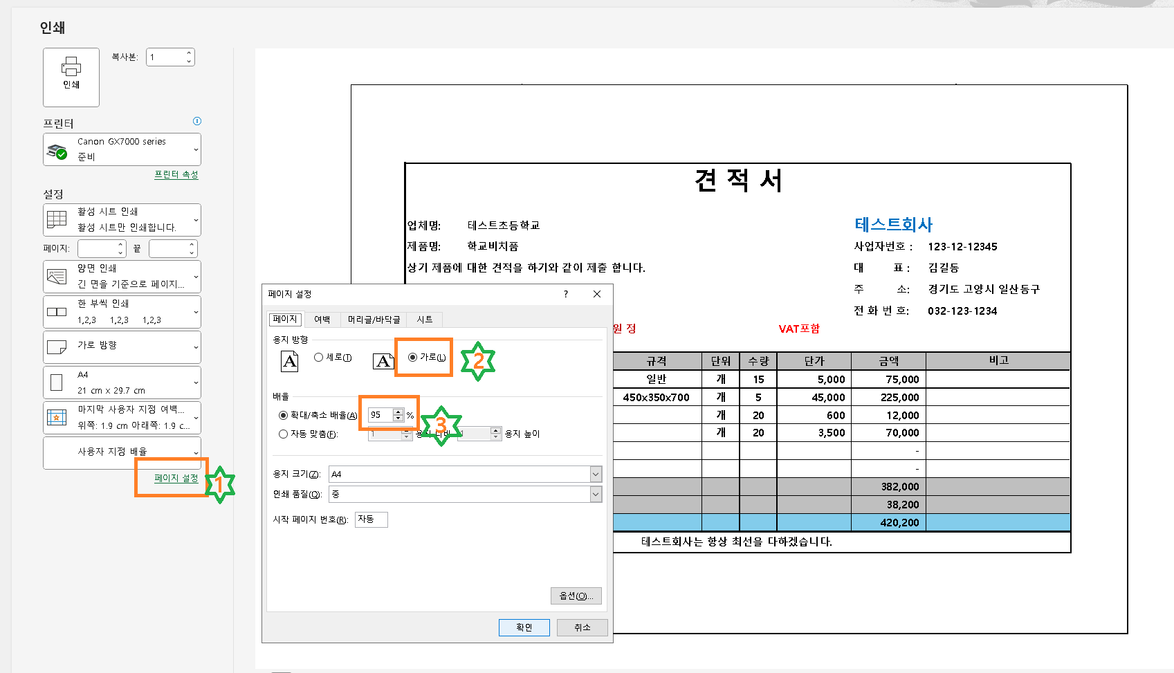 먼저 1번 페이지설정을 누르면 페이지 설정창이 생기고 2번 가로에 체크 3번 100% -> 95%로 변경하고 확인을 누릅니다.