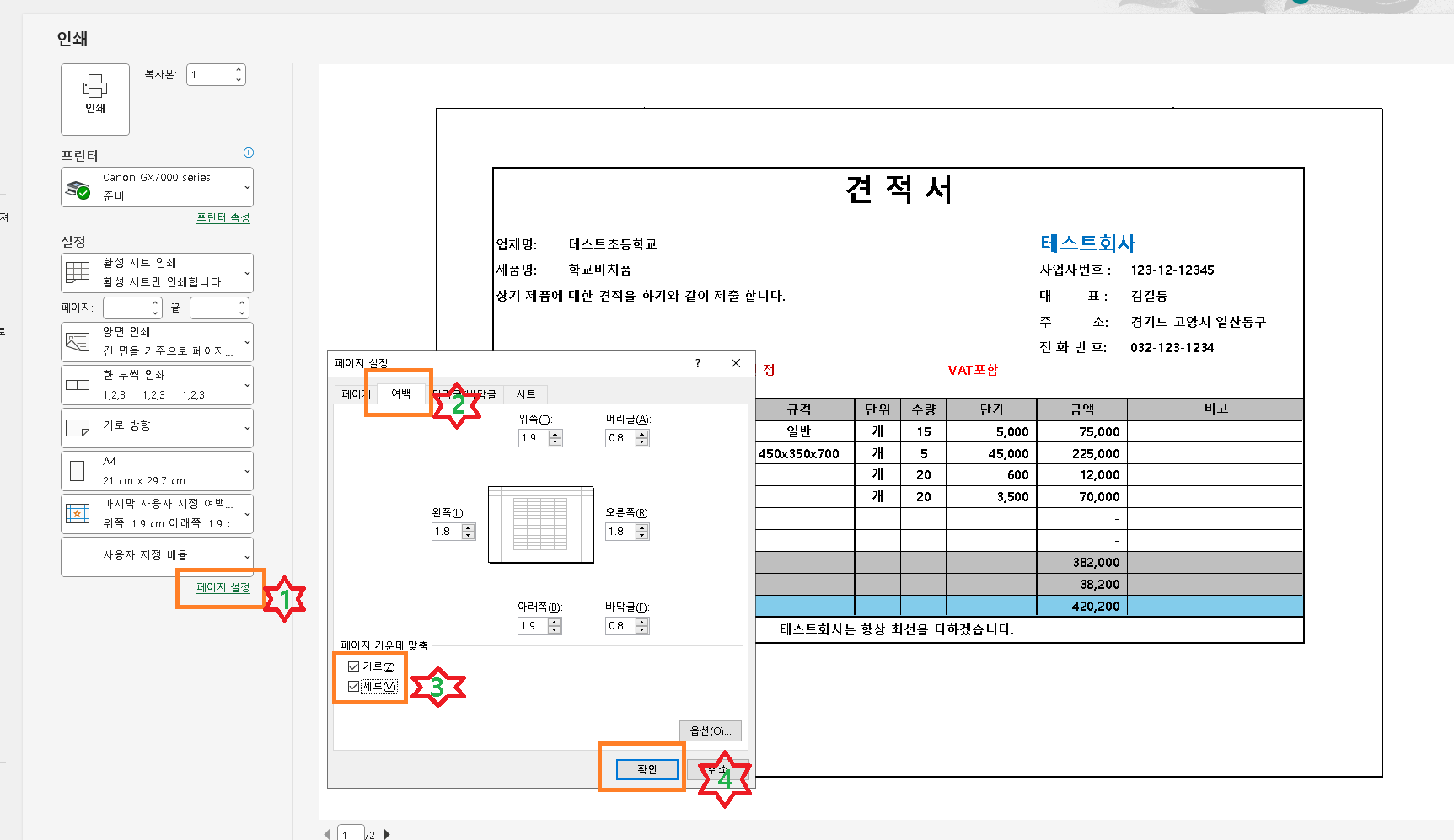 1번 페이지설정을 누르고 2번 여백탭으로 들어갑니다. 그다음 3번 가로,세로에 체크하고 4번 확인을 누릅니다.