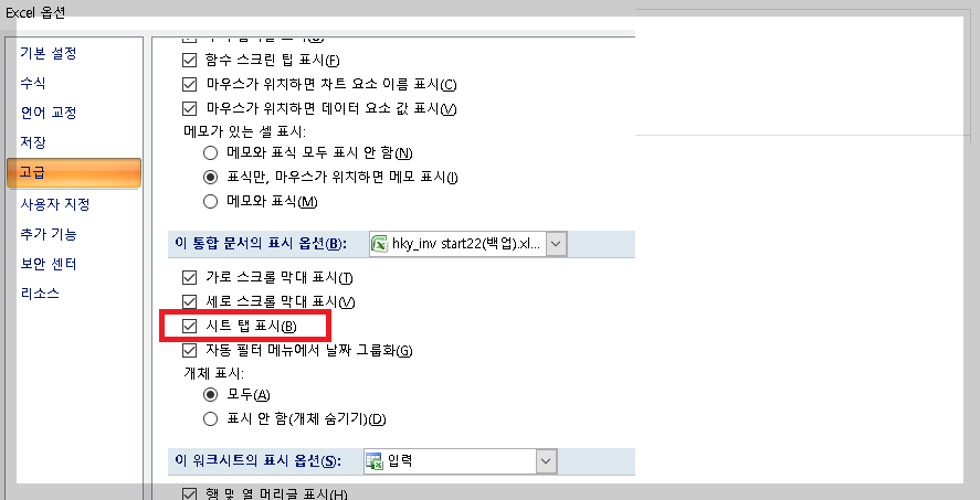 - ‘이 통합 문서 표시 옵션’ 항목에서 시트 탭 표시 항목에 체크