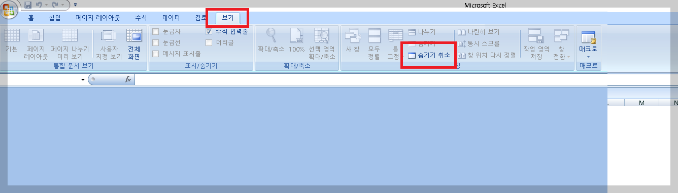 | 엑셀 창은 있는데 아무것도 안 보임 | 창 숨김(Hide) 상태 | 보기 → 숨기기 취소(Unhide) |