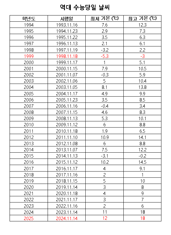 아래 표는 역대 수능 당일 최저 온도와 최고 온도를 나타내는 표 입니다.