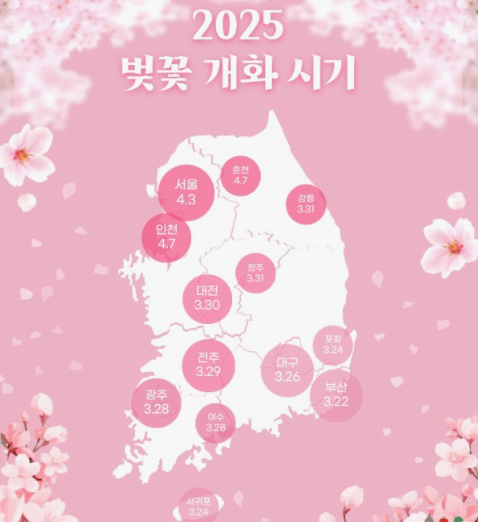 | 부산광역시 | 온천천 | 도심 속 4km 길이의 벚꽃 산책로로, 산책과 사진 촬영에 적합합니다. 지하철 1호선 명륜역 2번 출구에서 도보 10분 거리입니다. | 3월 31일 |
