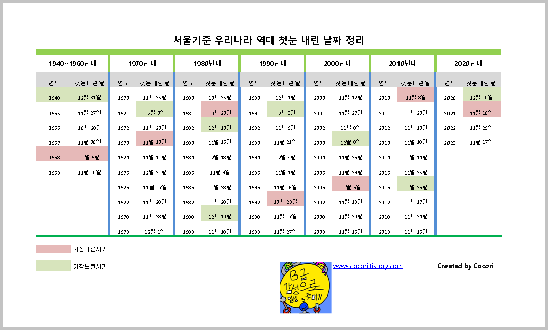 위 자료가 우리나라 첫눈온 시기 및 날짜에 대한 궁금증을 조금이나마 해소 하는데 도움이 되었으면 합니다.