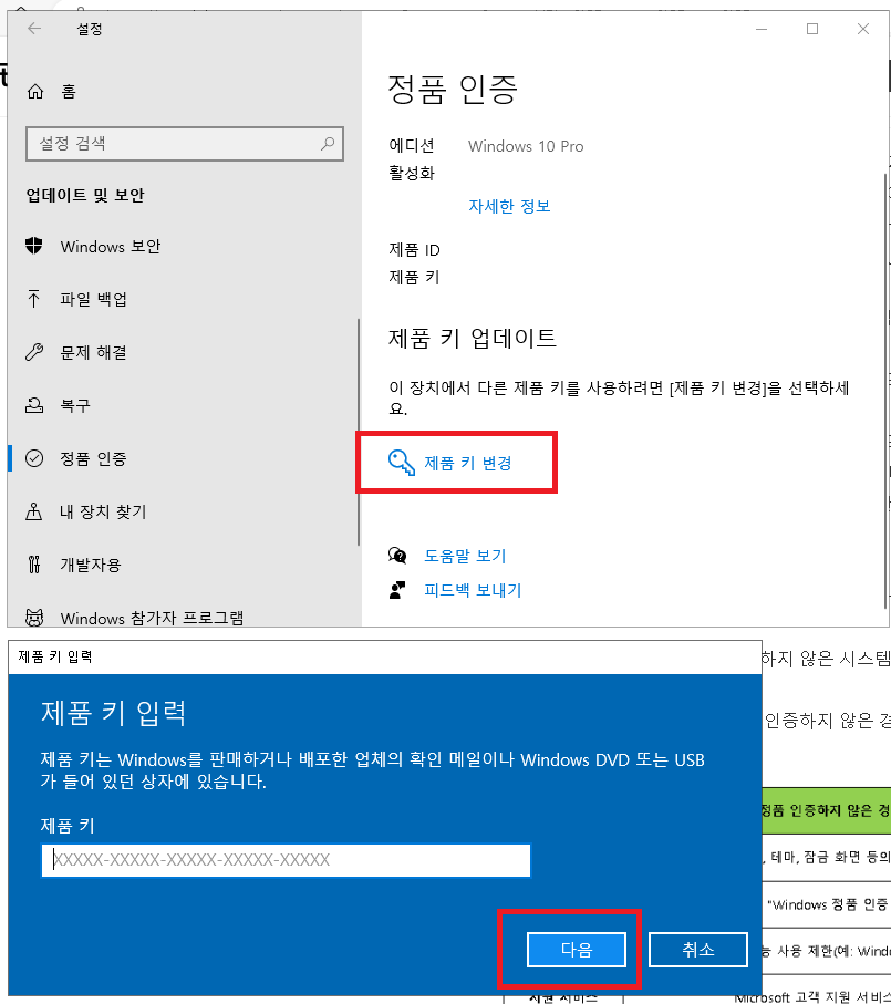 모니터 화면 왼쪽하단의 시작 또는 ( 윈도우키 + I ) -> 설정 선택후 -> 업데이트 및 보안 -> 정품 인증 -> 제품 키 입력(25자라의 제품키를 입력합니다.) 제품 키가 없는 경우에는 마이크로 소프트 스토어에서 제품 키를 구매해서 진행해야 합니다.