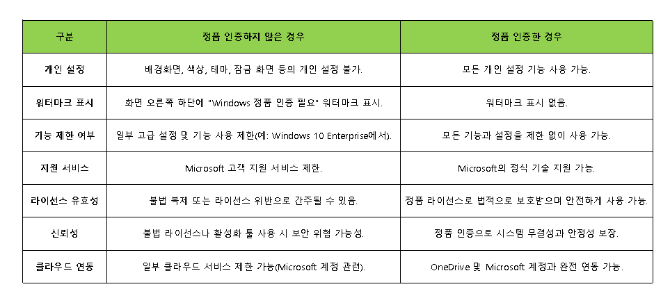 아래 표는 윈도우 정품 인증한 경우와 인증하지 않은 경우의 차이점을 표로 만든 것입니다.