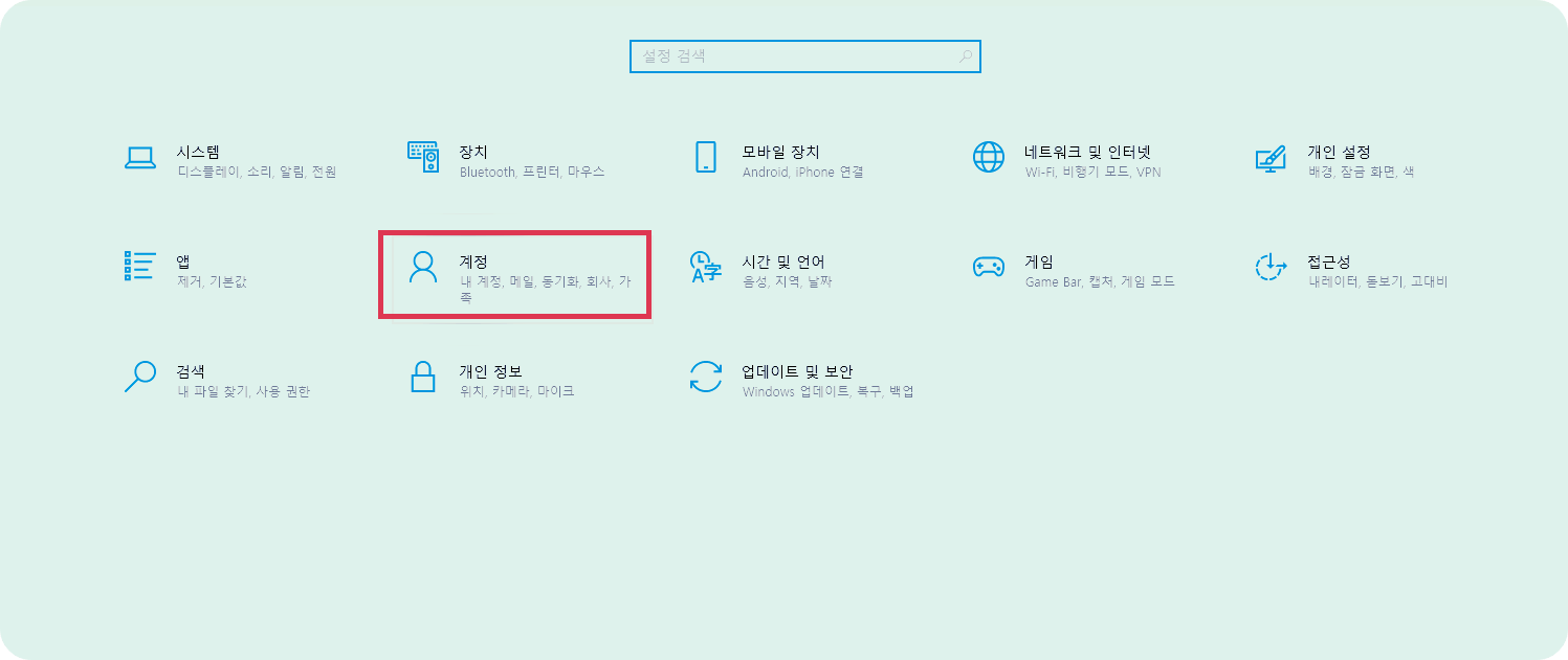 2.설정창에서 빨간박스로 표시한 계정을 마우스클릭하여  들어갑니다.
