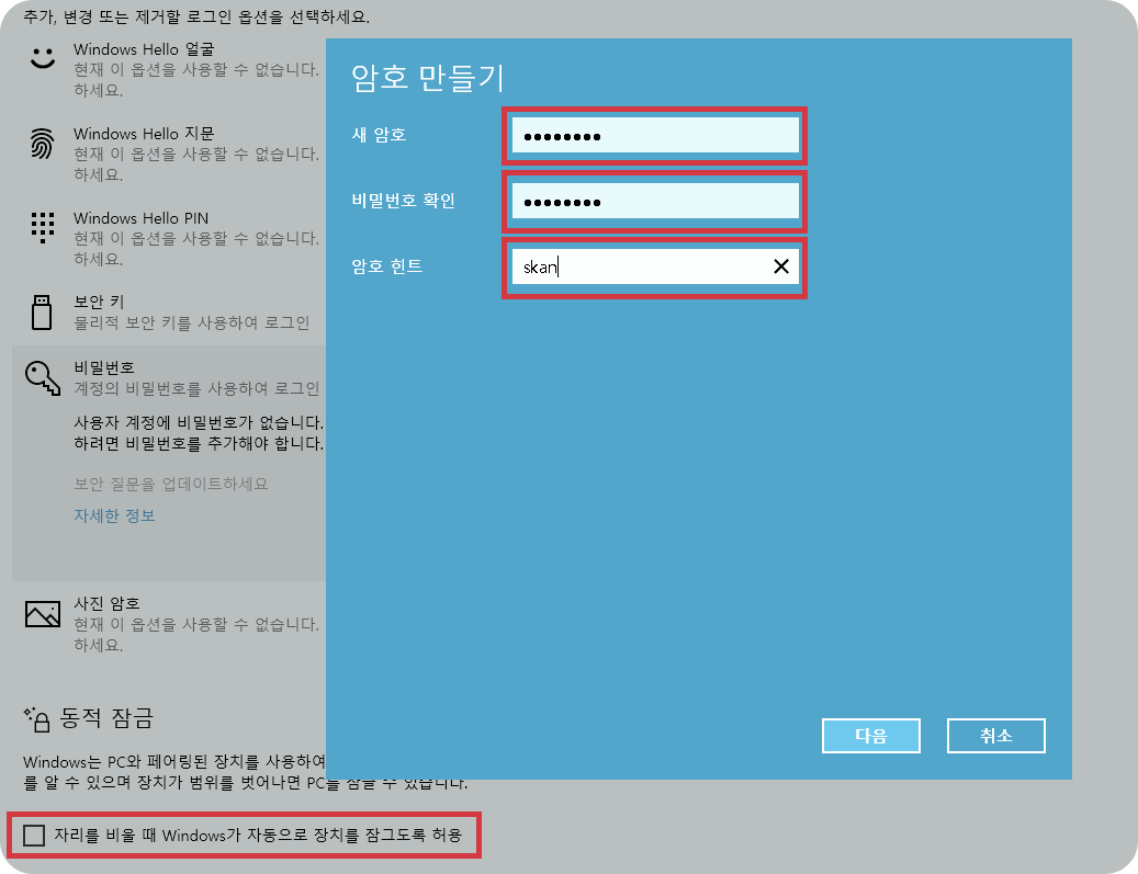 윈도우 시스템을 사용할 경우 보안을 위해 컴퓨터 사용시 비밀번호를 설정할 수 있는 기능이 있습니다.