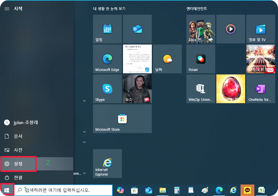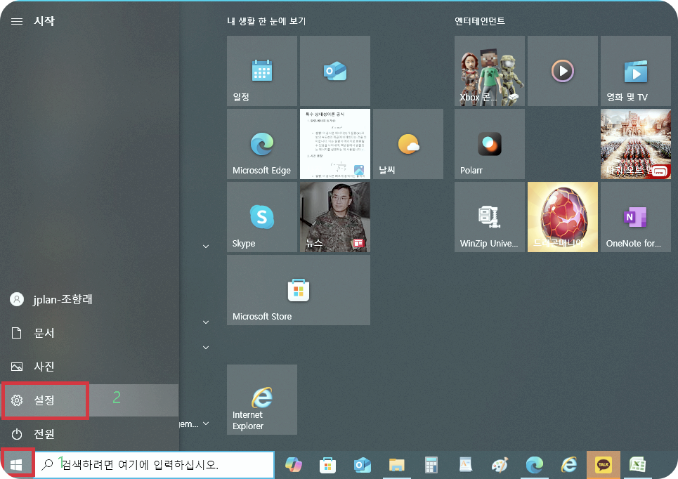 1. 시작 메뉴의 설정으로 들어갑니다.