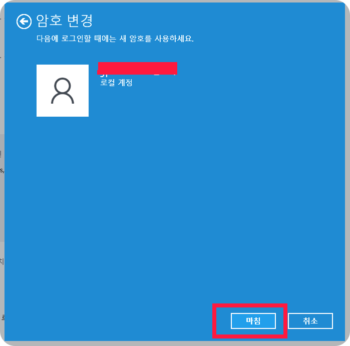 6.다음 클릭후 마지막으로 마침을 클릭하면 새 비밀번호로 설정했으면 새 비밀번호가 적용되고 비밀번호 없이 공란으로 두었으면 비밀번호 없이 컴퓨터를 사용할 수 있게 됩니다.