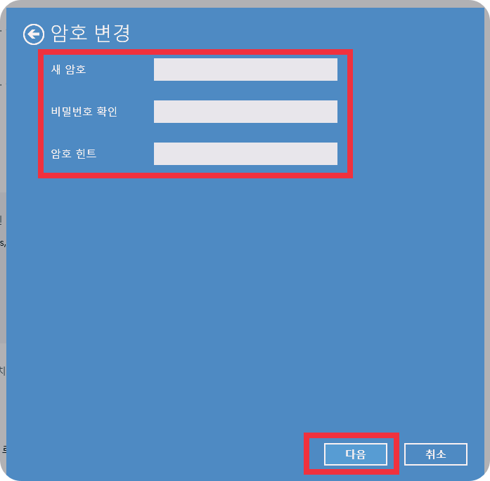 5.다음을 클릭하면 새로운 암호를 작성하는 창이 뜨는데 이곳에 비밀번호를 변경하고 싶으면 새 비밀번호를 작성하고 만약 비밀번호 자체를 없애고 비밀번호 없이 컴퓨터를 사용하고 싶으면 공란으로 비운후 다음을 클릭합니다.